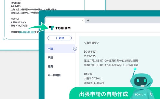 経理AIエージェントTOKIUMは、AIとプロスタッフが連携し、経理業務の自動化を推進するサービスです。このサービスは、出張手配、事前申請、突合といった定型的な経理作業からビジネスパーソンを解放することを目指しています。