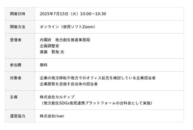 企業版ふるさと納税を活用した地域課題解決プラットフォーム「river(リバー)」を運営する株式会社カルティブ(本社:神奈川県横浜市、代表取締役:池田 清)は各省庁の出している補助金・交付金の活用方法を自治体様向けに伝える「地方創生制度活用シリーズセミナー」として、2025年7月15日(火)に内閣府担当者によるオンラインセミナー「地方への企業移転・拡充の支援について」を開催します。