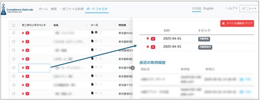さらに、2025年6月5日に新たに提供を開始した「コンプライアンス・ステーション(R)︎UBO モニタリング」は、法人の重要な変化(業種・事業活動・実質的支配者の変更など)をタイムリーに検知し、ユーザに通知。従来の1~3年ごとの定期的な情報収集では見落とされがちなリスクに対して、常に最新の情報に基づく継続的な顧客管理を可能となります。