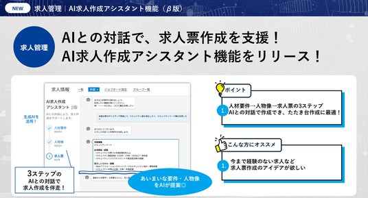 1)採用環境の変化への対応昨今、採用活動は多様化・複雑化が進み、複数の採用手法やHRサービスを組み合わせる企業が増えています。こうした変化に対応すべく、連携するHRサービスの拡充や、「キャリア採用」の質を高める大型アップデートなどを実施しました。また、求人票の作成をAIで支援する「AI求人作成アシスタント」など、新たな技術を取り入れた機能もリリースしています。
