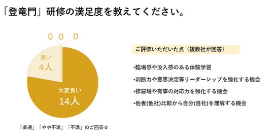 パナソニックグループ様との協業で開催した2024年度第1回登竜門には、大手電機メーカー、総合化学メーカーなど、18社50名の受講生が参加。各参加企業の人事から高い評価をいただいています。