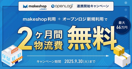「makeshop byGMO」の利用者でエンタープライズプランとプレミアムプラン、各プラン先着10社限定(申込期間内の契約締結順)、物流アウトソーシングサービス「オープンロジ」の利用料金(入荷料・保管料・配送料)が最大2カ月間無料。