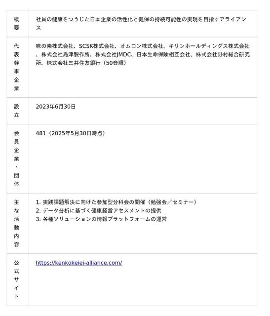 同アライアンスは、味の素株式会社、SCSK株式会社、オムロン株式会社、キリンホールディングス株式会社、株式会社島津製作所、株式会社JMDC、日本生命保険相互会社、株式会社三井住友銀行(50音順)が代表幹事として運営しています。