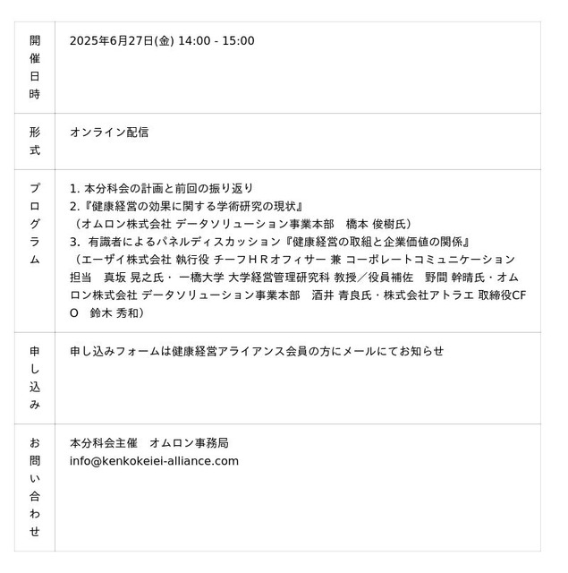 オムロン株式会社が主催する分科会「健康経営の投資対効果」は、データドリブンの健康経営実践に向けた、健康経営の投資対効果を考えることを目的に実施されます。
