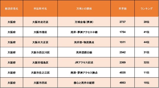 現在開催中の大阪・関西万博(2025年4月~10月)の会場である夢洲(此花区)を取り巻く市区の車室数状況を比較したところ、やや意外ともいえる結果が見られました。