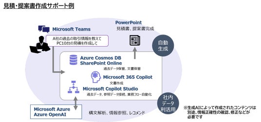 営業業務向けのAI活用サービスは、生成AIが顧客に関する情報の収集から、見積書、提案書の作成を効率化するものです。お客様が使用しているSFA(営業支援)/CRM(顧客管理)システム、Microsoft アプリケーションとMicrosoft 365 Copilotを連携させることが可能です。Microsoft Teamsを介してチャット形式で指示をすると見積の自動作成や、関連提案情報の取得を簡単に行えるほか、提示された情報をCopilot in PowerPointに読み込ませることで、提案先に応じた提案書のドラフトを作成でき、営業業務の負担を軽減します。