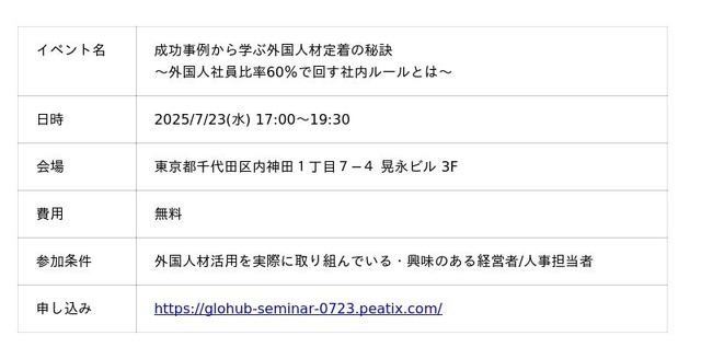 『Global Hub(グロハブ)』を運営する株式会社Linc(東京都千代田区、代表取締役:仲 思遥、以下「当社」)は、『成功事例から学ぶ外国人材定着の秘訣~外国人社員比率60%で回す社内ルールとは~』を、2025年7月23日(水)、当社オフィス(東京都千代田区内神田)にて開催いたします。本イベントでは愛知県に本社を構え、愛知県以外にも岐阜県、三重県、滋賀県で豚旨うま屋ラーメンを展開している株式会社ディ・エー・アイ山田様をゲストに迎え、外国人材採用直後と現在のビフォー・アフターをご紹介いただき、具体例を交えながら失敗・成功体験談をお話しいただきます。