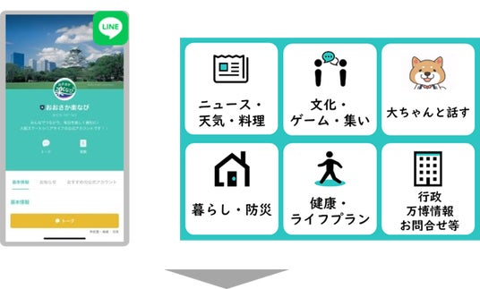 LINE公式アカウント「おおさか楽なび」を通じて、毎日の暮らしに役立つ情報や、行政サービス、事業に参画している民間企業による様々なサービスを提供