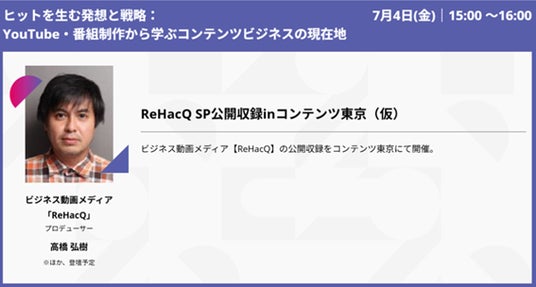149万人の登録者を誇るビジネス動画メディア【ReHacQ】の公開収録をコンテンツ東京にて開催!高橋弘樹プロデューサーがゲストを迎え、急速に変化する日本のコンテンツビジネスの現在地と未来を語り合います。