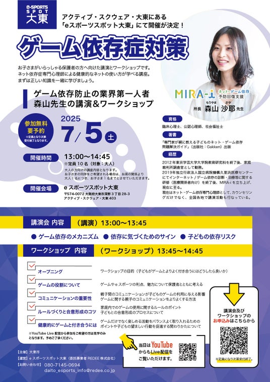 ネット・ゲーム依存症専門の予防・回復支援サービスを提供するMIRA-iの森山先生をeスポーツスポット大東にお招きし、ゲーム依存症について公演していただきます。