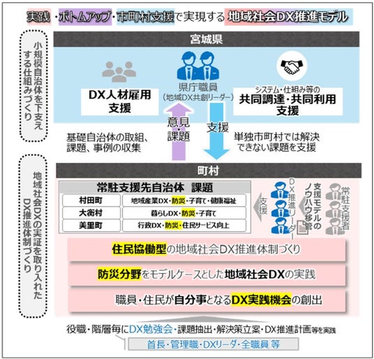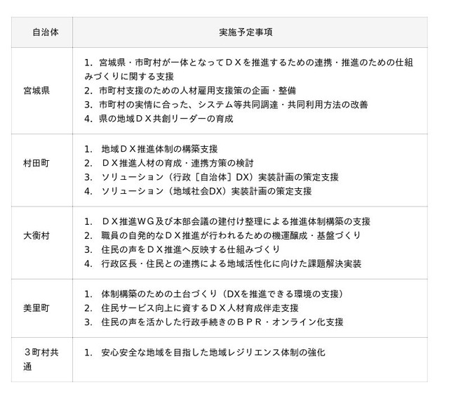 本事業では、宮城県および各町村の課題抽出から解決策検討、DX計画策定や実証を宮城県とNTT東日本が伴走することで、地域社会DXによる業務効率化・住民サービスの向上を目指します。具体的には下記の通り、支援地域にそれぞれ常駐支援者を派遣し、地域社会DX推進に向けた取組みを実施します。