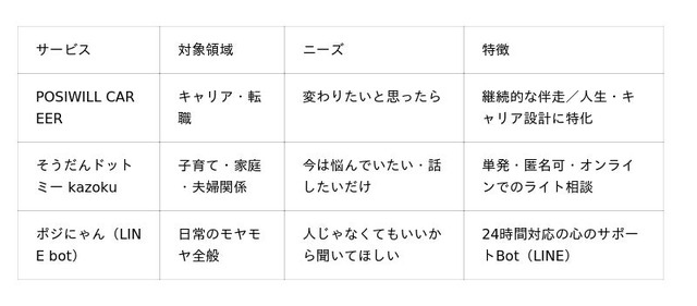 本サービスは、ポジウィル創業初期に存在した「そうだんドットミー」というプロダクトを、時代とニーズの変化に合わせて再構築したものです。企業と個人のはざまで揺れる「家庭・家族」の悩みに、より実用的かつ温度感の合った支援を提供するために再定義しました。