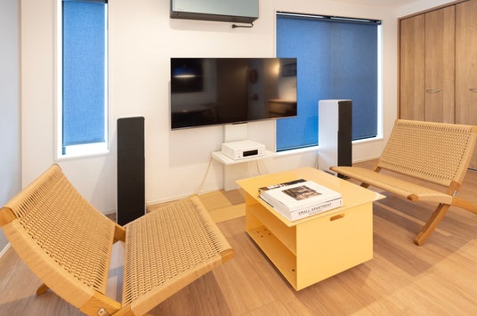 リビングには、55インチの大型TVを設置。さらに、高品質なアンプと、トールボーイ型のオーディオスピーカーを導入することで、まるで映画館のような臨場感あふれる視聴体験が可能です。