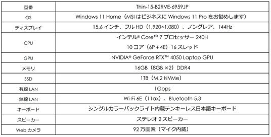 【Thin-15-B2RVE-6959JPの主な特徴】