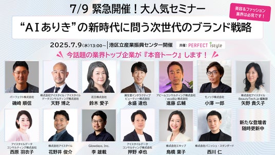 パーフェクト株式会社は、2025年7月9日(水)に東京都港区立産業振興センターにて、株式会社アイスタイルとの共催による業界向けセミナーを開催いたします。このたび資生堂インタラクティブビューティー株式会社、花王株式会社、株式会社エキップ、株式会社バニッシュ・スタンダードなど業界大手企業からの登壇者が決定しました。なお参加無料のため、お席に限りがございます。お早めにお申し込みください。