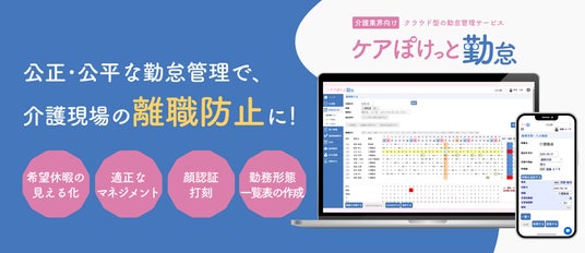 このような状況を受け、弊社は、介護人材をまもり、離職防止と採用促進を実現するためのクラウド型勤怠管理サービス「ケアぽけっと勤怠」のサービス提供を開始しました。