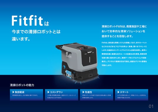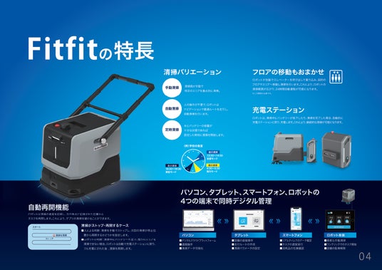 業務用清掃ロボット『Fitfit』は多様な清掃バリエーションと、パソコン、タブレット、スマートフォン、ロボット本体の4つの端末で連携する高度なデジタル管理システムが主な特長となっております。