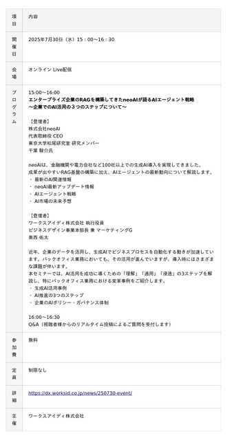 成果につながるRAGの構築法とAIエージェントの最新動向を解説。neoAI Chatのアップデート情報や戦略、今後のAI市場展望を交えながら、“成果が出るAI導入”の実践的なヒントをお届けします。