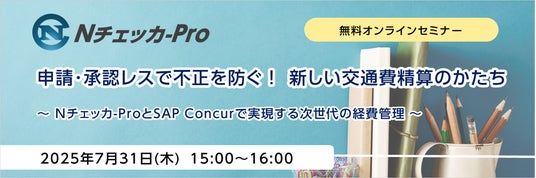株式会社ニーズウェル(本社:東京都千代田区、代表取締役会長兼社長 船津浩三)は、多くの企業からの引合と好評を受け、2025年7月31日(木)15時より、無料オンラインセミナー「申請・承認レスで不正を防ぐ! 新しい交通費精算のかたち ~ Nチェッカ-ProとSAP Concurで実現する次世代の経費管理 ~」を開催します。