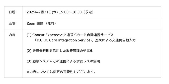 本オンラインセミナーでは、Nチェッカ-ProとConcur Expenseによる交通費入力レスと承認レスへのアプローチについて、交通系ICカードの連携や経費分析BI・勤怠システム連携で得られるメリットや当社活用事例を交えながら、詳しく解説します。