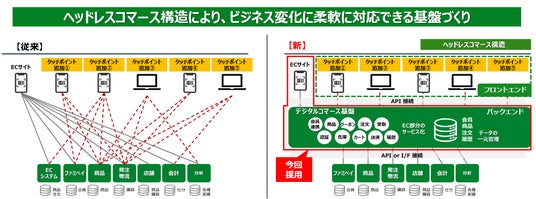 フロントエンドとバックエンドを分離し、それぞれが独立したヘッドレスコマース構造を採用することで、新たなタッチポイントへ対応する場合も、基幹となる業務ロジックへの影響を最小限に抑えることを可能にしました。
