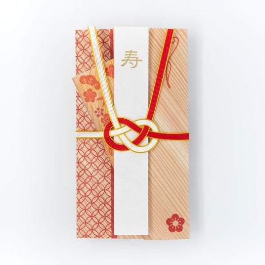 香り高い大分の杉材を使った木のぬくもり感じるご祝儀袋。伝統的な水引と天然木のやさしい質感が特徴。使い終わった後はしおりや飾りとしても再利用できます。