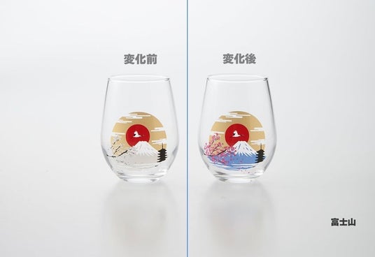 冷たい飲み物を注ぐと、グラスの側面に富士山の絵柄が美しく浮かび上がるユニークな冷感グラス。温度で変化する特殊な加工が施されており、飲み物の冷たさに反応して富士山が現れる仕掛けです。