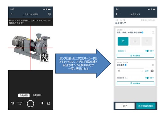 1つの給水ポンプに対して日常点検の「腐食、損傷、水漏れ等の有無チェック」と給排水ポンプ点検の「運転電流チェック」を行う場合、以前はそれぞれの業務をアプリ上に表示させる必要がありましたが、本アップデート後は給水ポンプに貼り付けたバーコードをスキャンするだけで、両方の点検項目が同時にアプリ上に表示されます。