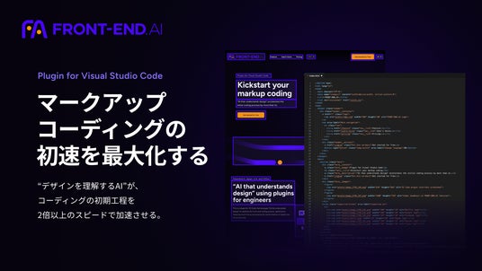 FRONT-END.AI( https://front-end.ai/ )は、フロントエンド開発における初期工程を AI によって自動化するWebエンジニア向け生成AIサービスです。Figmaプラグインを利用し、デザインカンプ・アセット一式・JSONデータをアップロードすると、日米中の特許取得AI『デザインを理解するAI』がHTMLと一部CSSを自動生成します。VS Codeプラグインで結果を確認し、必要に応じて編集が可能です。削減した時間で、Web制作会社やWebマーケティング会社が多くの案件を受注し、売上の最大化を追求することや、自社のエンジニアが最新言語の学習など成長する機会を提供し、長期的な利益最大化を目指す取り組みを行うことができます。