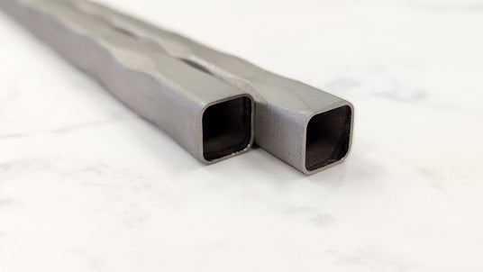 見た目は無骨なのに、持ってみるとふわりと軽い。重さ、細い箸で16g・太い箸でもわずか18gです。このギャップを生むのが、3Dプリンタでつくられた中空構造です。チタンを一層ずつ重ね上げて成形することで、従来の切削や鋳造では困難だった「中空構造」が実現しました。