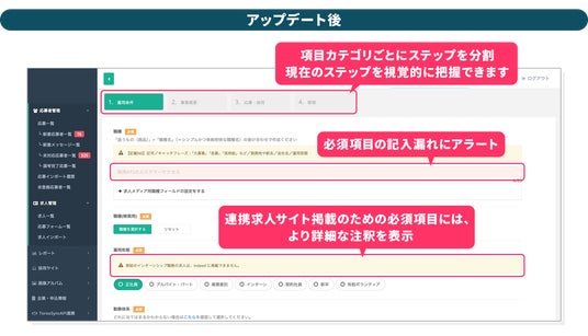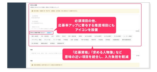 入力補完機能と入力ガイドの強化により、入力ミス・入力漏れを防止必須項目・推奨項目・任意項目を再整理・明示化し、連携求人サイトの審査落ちや応募率低下を防ぐ