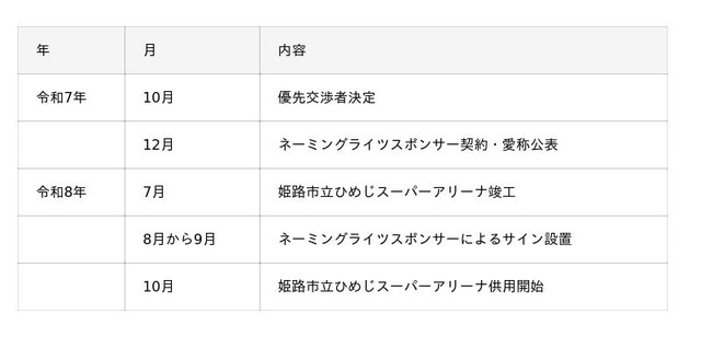 市民が呼びやすく施設イメージに合った親しみやすい愛称とすること、 愛称には「姫路」及び「アリーナ」(平仮等でも可)を含めることなど今後のスケジュール(予定)