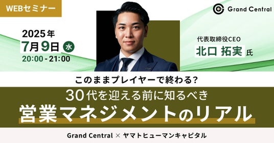 ヤマトヒューマンキャピタル株式会社(本社:東京都千代田区、代表取締役:堀江 大介)は、2025年7月9日(水) 20:00よりオンラインにて、株式会社Grand Central 代表取締役CEO 北口 拓実氏にご登壇いただくウェビナー『このままプレイヤーで終わる?30代を迎える前に知るべき営業マネジメントのリアル』を開催いたします。