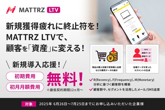 『MATTRZ LTV』のサービス開始を記念し、初期費用と初月月額費が無料になるキャンペーンを実施いたします。- キャンペーン内容:先着30社限定初期費用、および初月月額費用が無料
