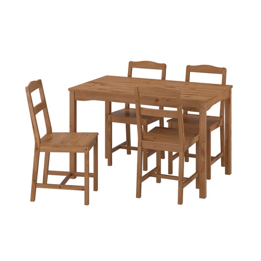 テーブルとチェア4脚のダイニングセットで全てのパーツがひと箱に収まっています。天然素材のパイン無垢材を使用しているので頑丈で、使い込むほどに風合いが増します。天然木ならではの木目模様は一つとして同じものがなく、どのテーブルもチェアも個性的な魅力にあふれています。アンティークステインが柔らかい印象を与えます。