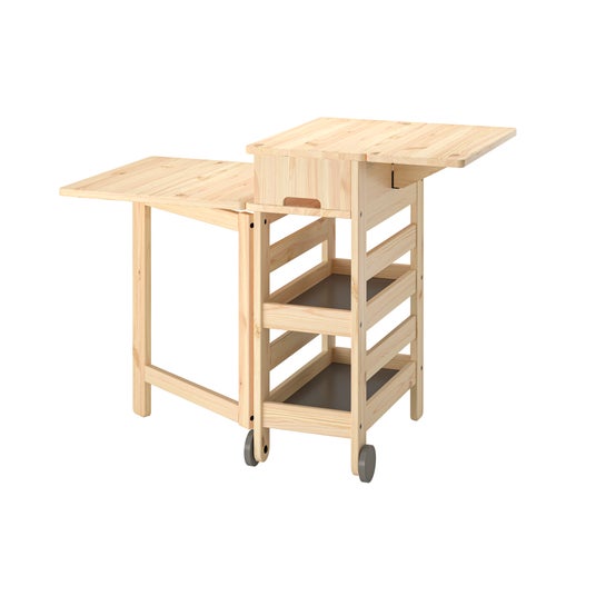 小さなスペースで活躍するアイテム。ドロップリーフはデスクとしても、2人用ダイニングテーブルとしても使え、使わない時は簡単にたためてスペースを有効活用できます。高い方のテーブルは食材を準備するためのワークスペースや、バーテーブルとして使えます。真ん中の収納棚はいつでも簡単に手が届き手近に物を収納できます。キャスター付きで、サイドに持ち手穴があるので、簡単に移動できます。