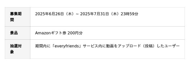 また「everyfriends(エブリフレンズ)」の開設を記念し、「everyfriends」のアカウント作成後に、動画を投稿してくださった方の中から、先着で1,000名様にAmazonギフトカードをプレゼントするキャンペーンを開催しています(※)。