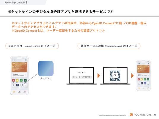また、もう1つの既存サービスである「PocketSign Link(ポケットサイン・リンク)」は、住民の防災と暮らしの利便性向上のために当社が提供している自治体公式スーパーアプリ「ポケットサイン」の情報を活用し、ミニアプリ(In-Appサービス)を作ったり、サービス連携(OpenID Connect)により個人データにアクセスしたりできるようになります。
