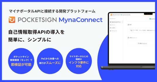 ポケットサイン株式会社(本社:東京都新宿区、代表取締役:梅本滉嗣、以下当社)は、マイナポータルAPI*を活用したい事業者向けに、マイナポータルAPIとの接続を仲介するプラットフォーム「PocketSign MynaConnect(ポケットサイン・マイナコネクト)」の提供を開始しました。これは当社が事業者向けに提供しているオープン開発プラットフォーム「PocketSign Platform」上の新機能として提供されます。今回のPocketSign MynaConnectでは、当社独自のオリジナル開発環境(モック環境)を備えているため、アプリ・Webサービスの開発事業者は、マイナポータルAPIの利用検討・利用申請中であっても、本番環境と同じ仕様でシステム開発を円滑に進行することができるようになり、導入までの開発体験が飛躍的に向上します。