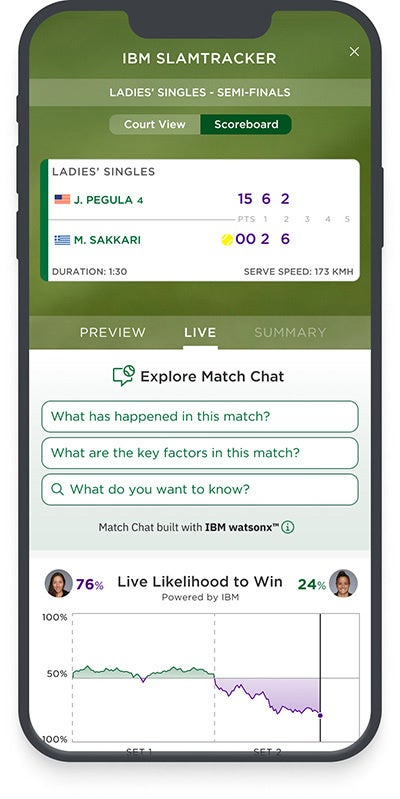 IBMとオール・イングランド・ローンテニス・クラブは、今年のウィンブルドン選手権に向け、AIを活用した新たなデジタル体験の提供を発表しました。新機能の「Match Chat」は、シングルスの試合中にファンの質問に答えることができる対話型AIアシスタントで、本大会に合わせて提供を開始します。また、2021年に提供を開始した「Likelihood to Win(勝利の可能性)」も機能を強化し、試合の進行に応じて変化する勝利予測をファンに提供します。