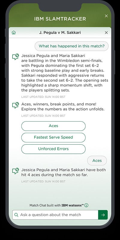 「Match Chat」は、「Wimbledonアプリ」と「wimbledon.com」で利用可能です。ファンは、事前に用意された質問文または自分自身の言葉でアシスタントに話しかけることができ(例:「この試合でより多くブレイクポイントを決めた選手は誰ですか?」、「この試合で優位に立っている選手は誰ですか?」など)、AIによって即時に試合の分析や回答が提供されます。これにより、試合の理解が深まり、ファンの観戦体験がさらに充実します。