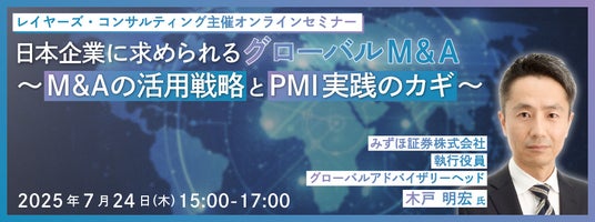 株式会社レイヤーズ・コンサルティング(東京都品川区、代表取締役CEO:杉野 尚志、以下:レイヤーズ)は、オンラインセミナー『日本企業に求められるグローバルM&A ~M&Aの活用戦略とPMI実践のカギ~』を2025年7月24日(木)に開催することを発表いたします。
