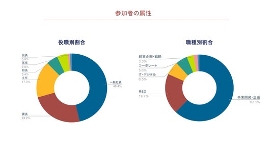 過去の参加者属性を見ると、1/4以上がマネジメント層にあたります。また、地方勤務・現場部門の方も一定数参加しており、オンラインならではの特徴です。参加者の職種を見ると、半数以上が事業開発や企画部門という結果になりました。また、1社あたりの参加者も他の越境プログラムと比べて多く、中には累計で50名以上が参加している企業も存在します。
