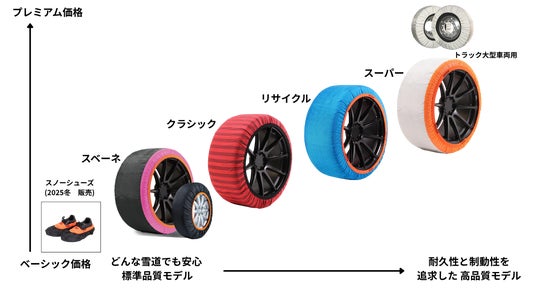 雪道でも安心 丈夫で汚れにくい 冬の強い味方。金属チェーンに匹敵するグリップ力を誇るイッセから、2025年冬、待望の新モデル「イッセ・スノーソックス リサイクル」が登場します。