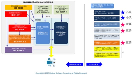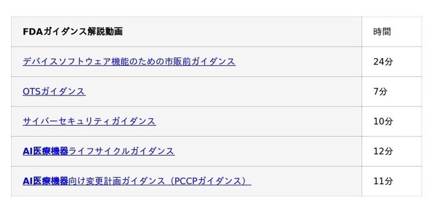 今回、IEC 62304 / ISO 14971 などの国際規格に加え、米国 FDA が発行している医療機器ソフトウェア系ガイダンスの解説動画5本(医療機器ソフトウェア系3本+AI特有2本)を公開しました。豊富な図表と具体的事例でわかりやすく解説しています。スタートアップ企業、開発エンジニア、RA/QA 担当者が短時間で規制全体像を把握できる構成です。