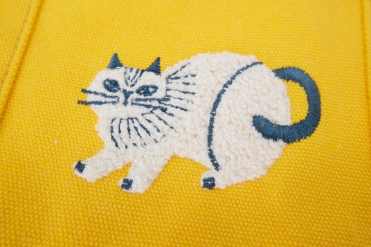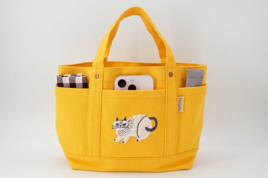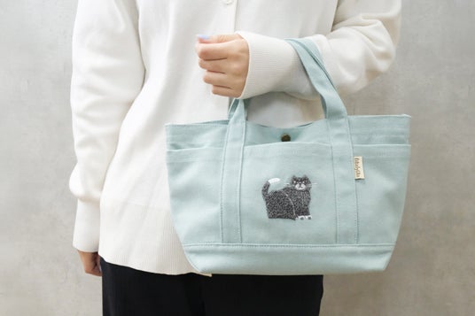 本製品は、ランチやお出かけなど日常のシーンに寄り添う、ちょうど良いサイズ感の帆布トートバッグです。デザインの主役となる中央の刺繍には、ふっくらと立体感のある「相良刺繍(さがらししゅう)」を採用。愛らしい猫のモチーフが、シンプルながらも印象的なアクセントを添えます。