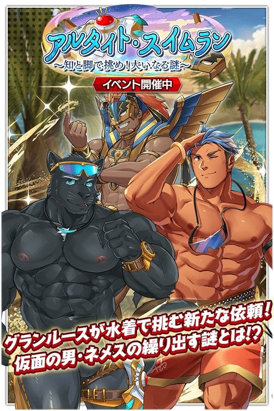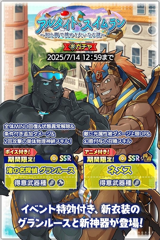 さらに、SSR魂友「渚の名探偵 グランルース」とSSR神器「ネメス」が入手可能な期間限定の「アルタイト・スイムラン~知と脚で挑め!大いなる謎~」ガチャも登場!