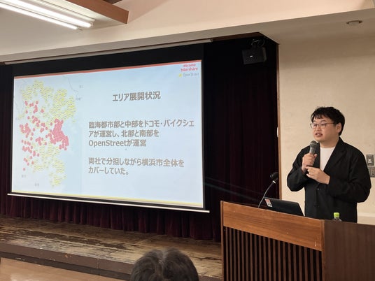 工藤は、株式会社ドコモ・バイクシェアの代表取締役社長の武岡雅則氏とともに登壇し、約100名の参加者を前に今月から神奈川県横浜市で開始したポート共有の事例を中心に、海外のシェアモビリティの在り方や、日本のシェアサイクルの課題感、今後の展望について説明しました。