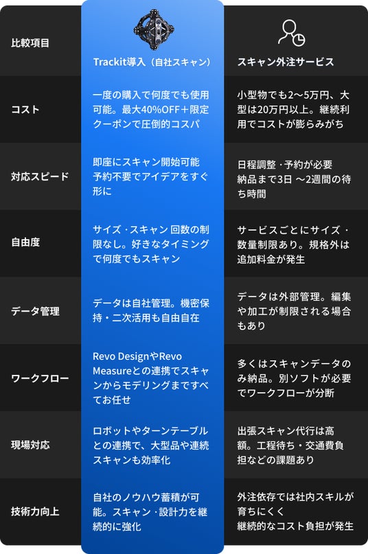 【比較でわかるトラキング式3Dスキャナーの優位性】