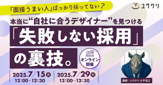 デザイナー・クリエイター専門の人材サービスを展開する株式会社ユウクリ(本社:東京都渋谷区、代表取締役社長:高橋 直道)は、デザイナー採用におけるスキルやカルチャーフィットの見極めに課題を抱える企業の人事・採用担当者様を対象とした無料オンラインセミナー【本当に“自社に合うデザイナー“を見つける「失敗しない採用」の裏技】を、2025/7/15(火)と29(火)に開催いたします。